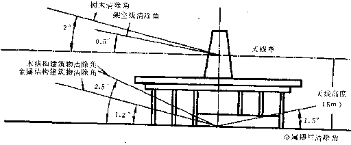 5.7.1 以天線為中心,半徑200 m以內(nèi)不得有建筑物(機房除外);半徑200 m以外,金屬結構建筑物的高度不應超過以天線基礎為準1.2o垂直張角,木質(zhì)結構建筑物的高度不應超過以天線基礎為準2.5o垂直張角。