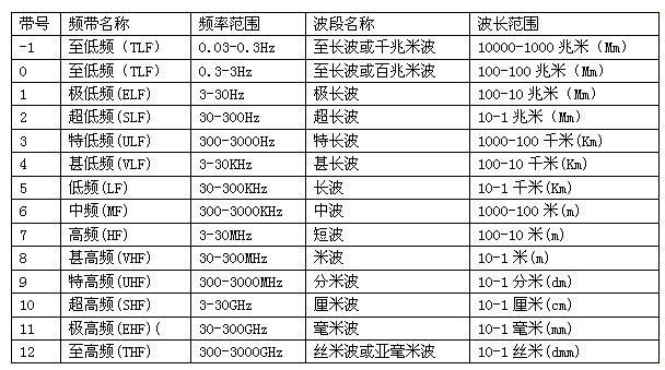 目前,根椐《中華人民共和國無線電頻率劃分規(guī)定》,我國已對9K~1000GHz頻帶內(nèi)的無線電業(yè)務(wù)做出了規(guī)劃,對無線電頻帶和波段也做了命名(見表1)。